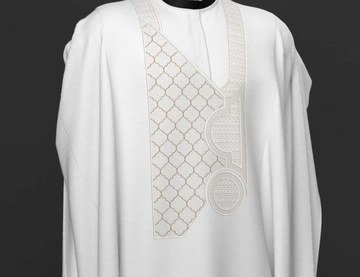 It is white agbada 3 quarter sleeve hand well made with original cashmere fabric, it is friendly to any type of skin. With monogram embroidery designs on it.