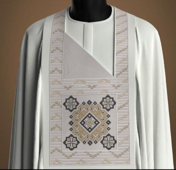 It is white agbada 3 quarter sleeve hand well made with original cashmere fabric, it is friendly to any type of skin. With monogram embroidery designs on it.