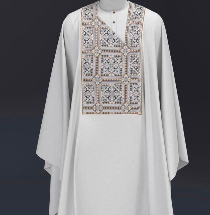 It is white agbada 3 quarter sleeve hand well made with original cashmere fabric, it is friendly to any type of skin. With monogram embroidery designs on it.