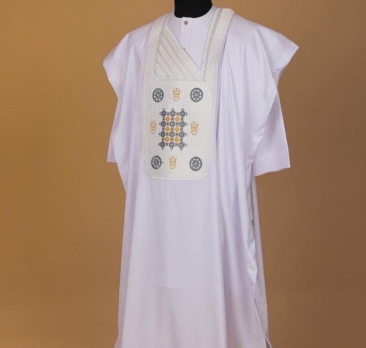 It is white agbada 3 quarter sleeve hand well made with original cashmere fabric, it is friendly to any type of skin. With monogram embroidery designs on it.