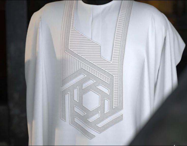 It is white agbada short sleeve well made with original cashmere fabric, it is friendly to any type of skin. With monogram embroidery designs on it.