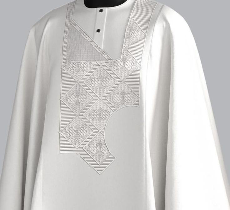 It is white agbada short sleeve well made with original cashmere fabric, it is friendly to any type of skin. With monogram embroidery designs on it.